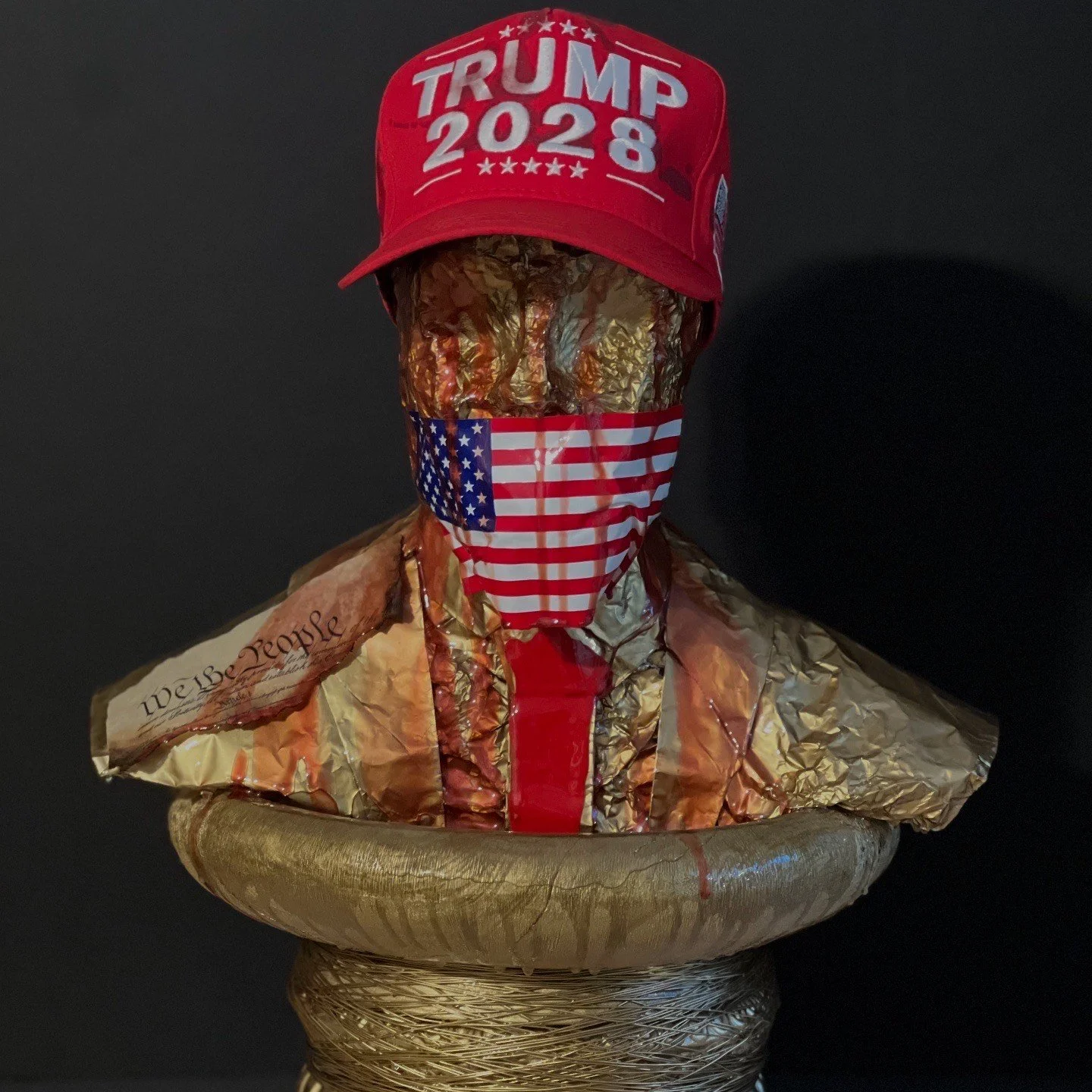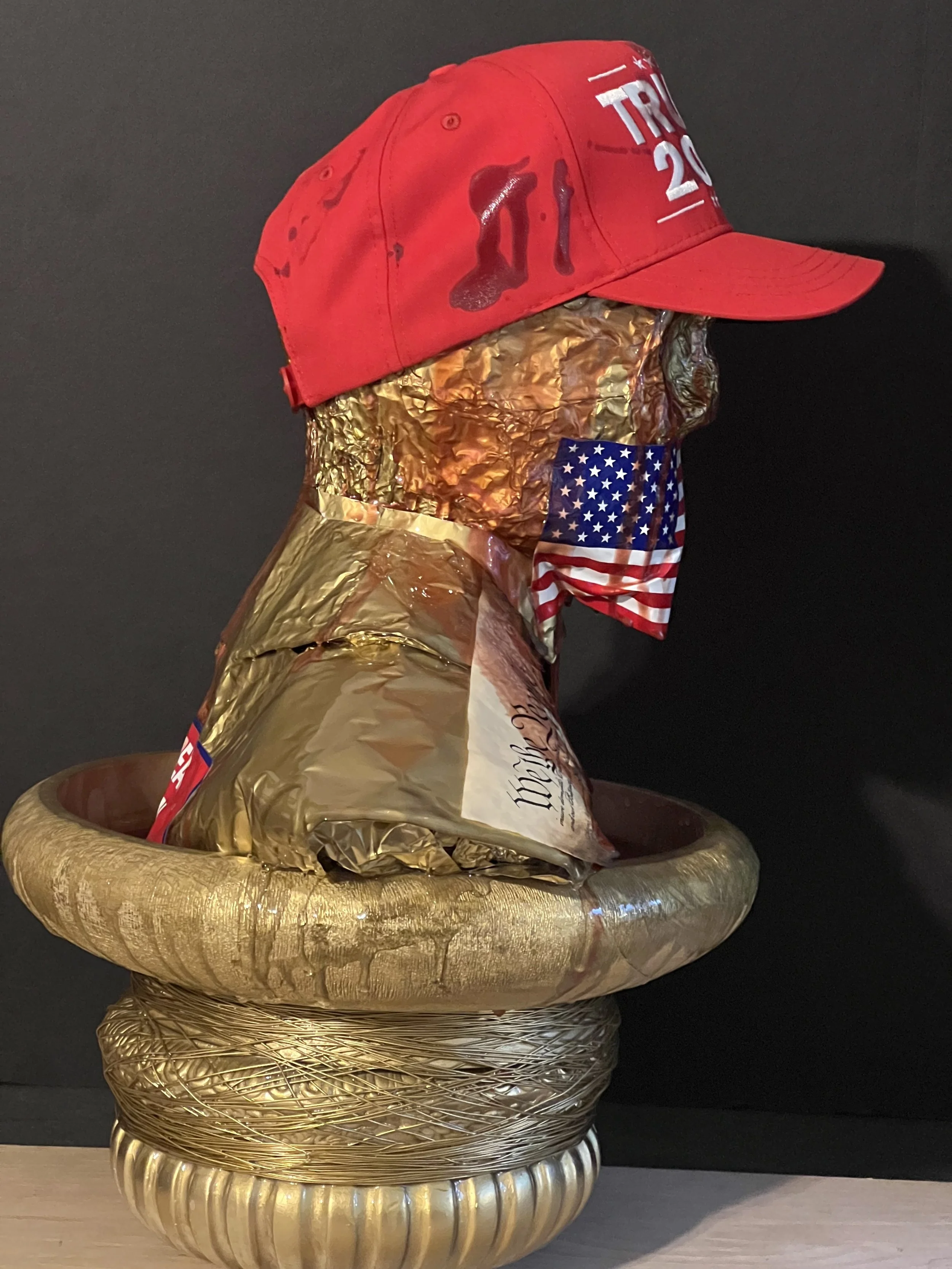 The base is made from some crap I found at hobby lobby and spray painted gold, just like the decorations that now adorn the Oval Office. A once proud country brought low in the name of profits, ratings, and internet ‘likes’.