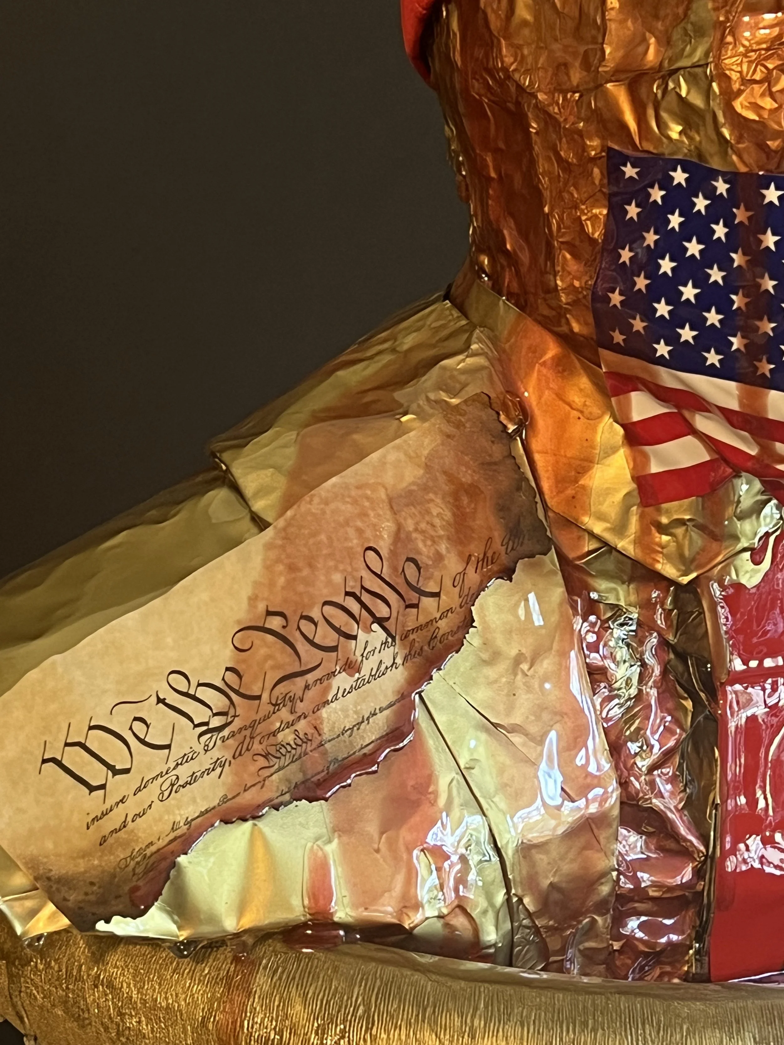 The American flag represents the gagging of the American people by false patriotism, ‘We the People’ the only remembered words of the once great constitution that the country was founded on, now broken and charred.