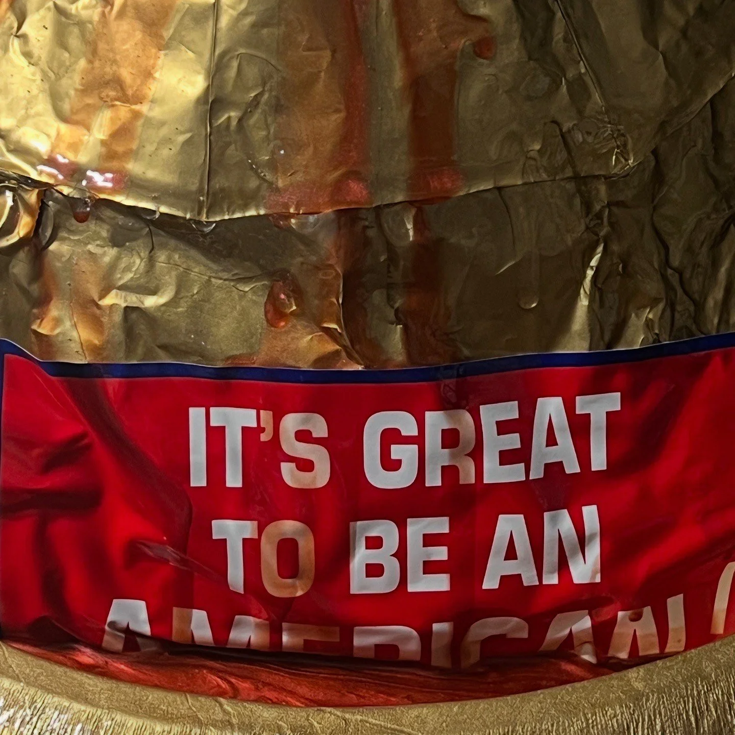 I received the ‘ITS GREAT TO BE AN AMERICAN’ sticker placed on the back of the sculpture with the 200 flags I purchased to put up along my city’s beach for Memorial Day in 2020 to honor the veterans during the COVID pandemic. Half buried in blood, it now represents the many forgotten service members who will suffer and die because of the budget cuts to the VA made by an unelected civilian in the name of ‘governmental efficiency’.